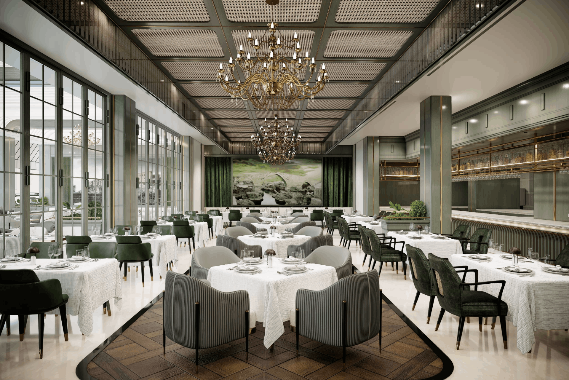 SOLEIL is conceived as an immersive journey where architecture, texture, and mood converge. Drawing inspiration from Parisian salons and Mediterranean warmth, the 7,000 sq ft venue features a rich yet understated palette—emerald velvets, warm wood, fluted columns, and crystal chandeliers suspended from a luminous coffered ceiling. Designed using advanced 3D visualization, the space balances high drama with minimalism, offering guests a serene and indulgent retreat.